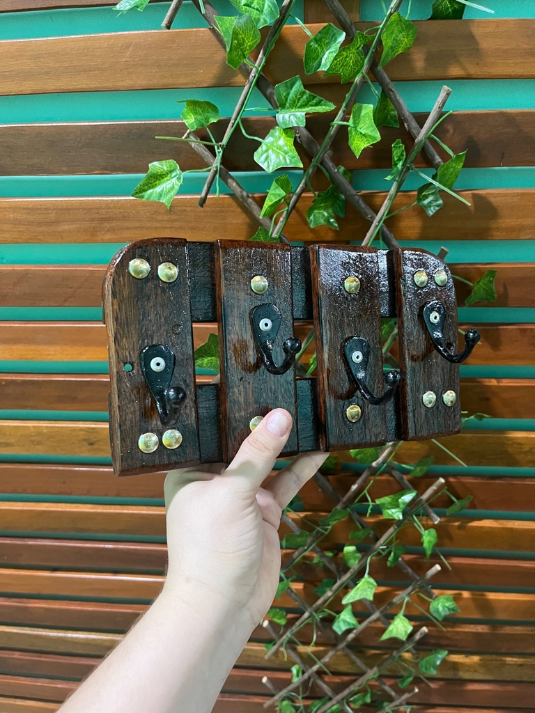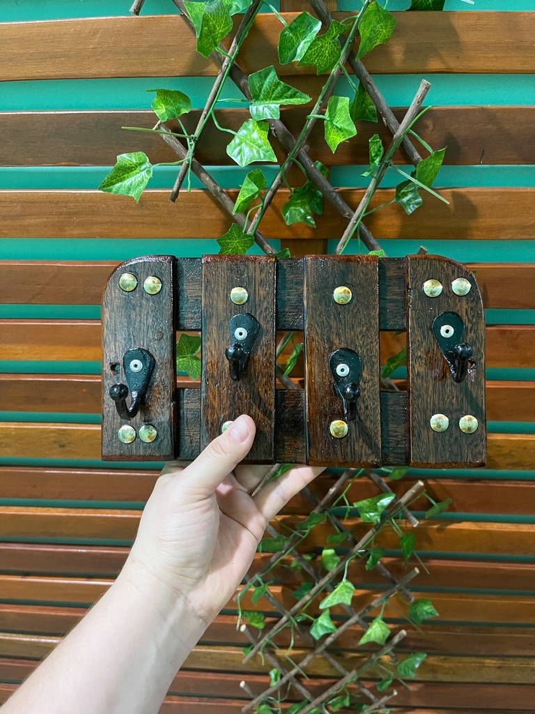 Confeccionado em madeira de lei regional, ganchos em alumínio fundido (não enferruja).